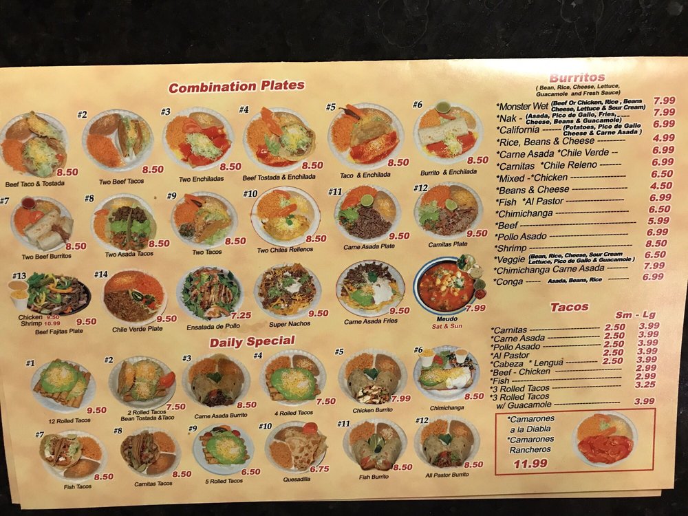 Includes lettuce pico de Gallo and guacamole. Asada, Pollo asado, carnitas, Al pastor